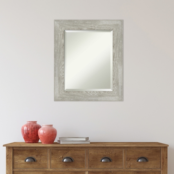 Our Dove Gray Scoop Frame Beveled Mirror will freshen up your walls with neutral, rustic style! The weathered woodgrain finish suits any décor style from farmhouse to contemporary. Overall mirror measures 22L x 1.4W x 26H in. Crafted of plastic and glass Gray woodgrain finish Rectangular shape with beveled design Scoop frame design Weight: 14.5 lbs. Hangs from back-mounted hardware Care: Dust with a soft, dry cloth. To clean mirror, spray a small amount of glass cleaner onto a lint-free cloth and wipe clean. This item is available at Kirklands.com only, not available in stores. Please note: this item cannot be shipped to APO/FPO addresses. WARNING: This product can expose you to chemicals including formaldehyde which is known to the state of California to cause cancer and birth defects or other reproductive harm.