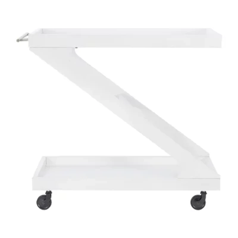 Elevate any gathering with the striking z shaped design of this bar cart, a standout addition to every party. The solid wood frame, gleaming in lustrous white, cradles a tempered glass top and a walnut veneer on the open lower platform. Effortless transportation is assured by easy glide wheels, while wooden borders on both levels keep your items secure. Beyond its role as a bar cart, transform it into a coffee station, plant stand, dining storage, or end table, ensuring style and versatility for any occasion.