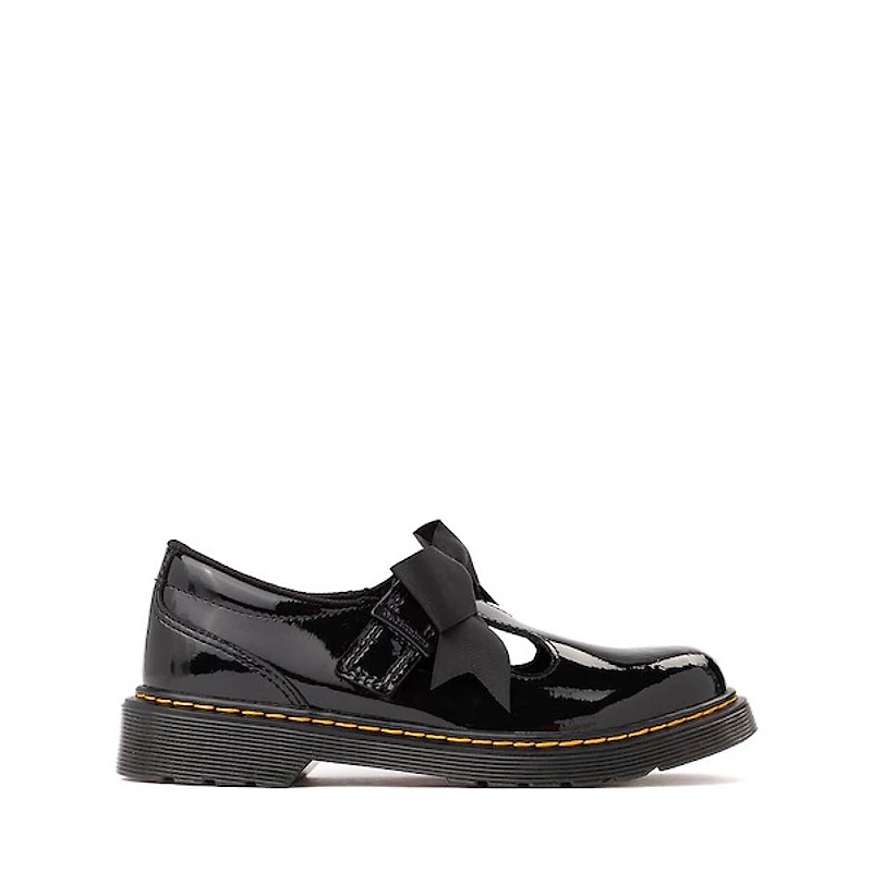Accentuate their cute style with the new polley ii bow mary jane shoe by dr. Martens. This adorable mary jane features glossy patent lamper leather uppers with decorative bow detail, buckle strap with hidden hook-and-loop closure for easy on and off, and cemented sole construction with signature yellow welt stitching. Available online at journeyskidz. Com.
