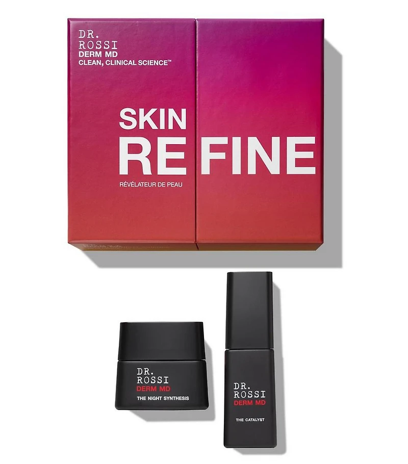 Skin Refine Set. Benefits: Discover the transformative power of Dr. Rossi's clinically proven night cream and serum in this full size duo. With proprietary Bio-Theriac complex, these formulas work together to help reduce the appearance of fine lines and wrinkles while helping calm irritation. Packaged in a custom luxury 100% paper, fully recyclable box.. Beauty lovers will adore this skincare duo for radiant, healthy skin, elegantly packaged in a luxurious, fully recyclable pink-reddish gift box. The clinically proven night cream and serum work together to visibly reduce fine lines and wrinkles while calming irritation. Whether treating your partner or indulging in a night of self-care, this set is the ultimate way to pamper and rejuvenate from the comfort of home, no matter the occasion.. Includes: THE NIGHT SYNTHESIS Restructuring Concentrate, 50 mL. THE CATALYST Intense Renewing Serum, 30 mL. :