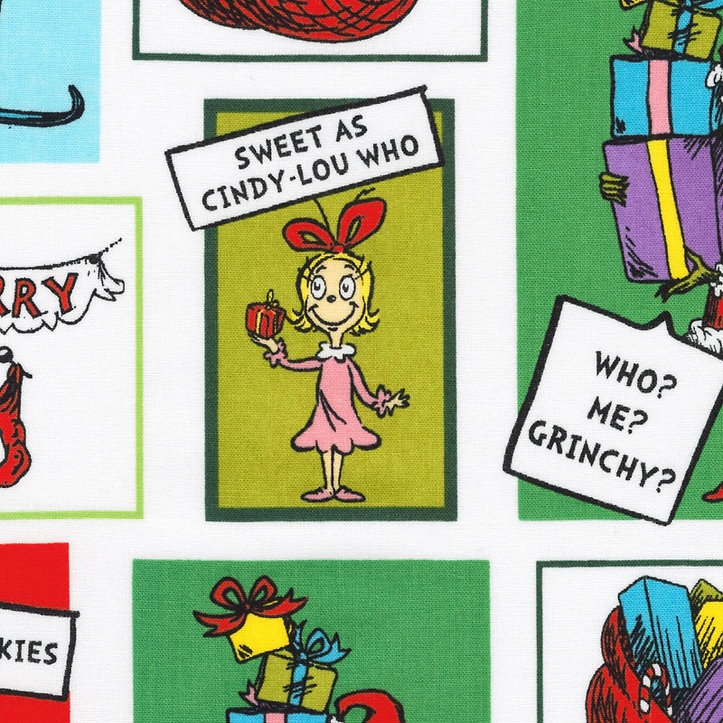 Use this Grinch tales fabric featuring lines from the classic characters in comic style art to make festive fabric crafts or décor. The cotton fabric is versatile for projects from hair ties and bandanas to quilts or pillowcases. Add a playful, fun touch to your handmade items with this treasured holiday character from Dr. Seuss. Pattern: Grinch tales comic book panel style Contents: 100% cotton Width: 44" Maximum cut length: 8 yd.Officially licensedNote: While we will do our best to fulfill your order in one continuous cut, you may receive your order in multiple cuts