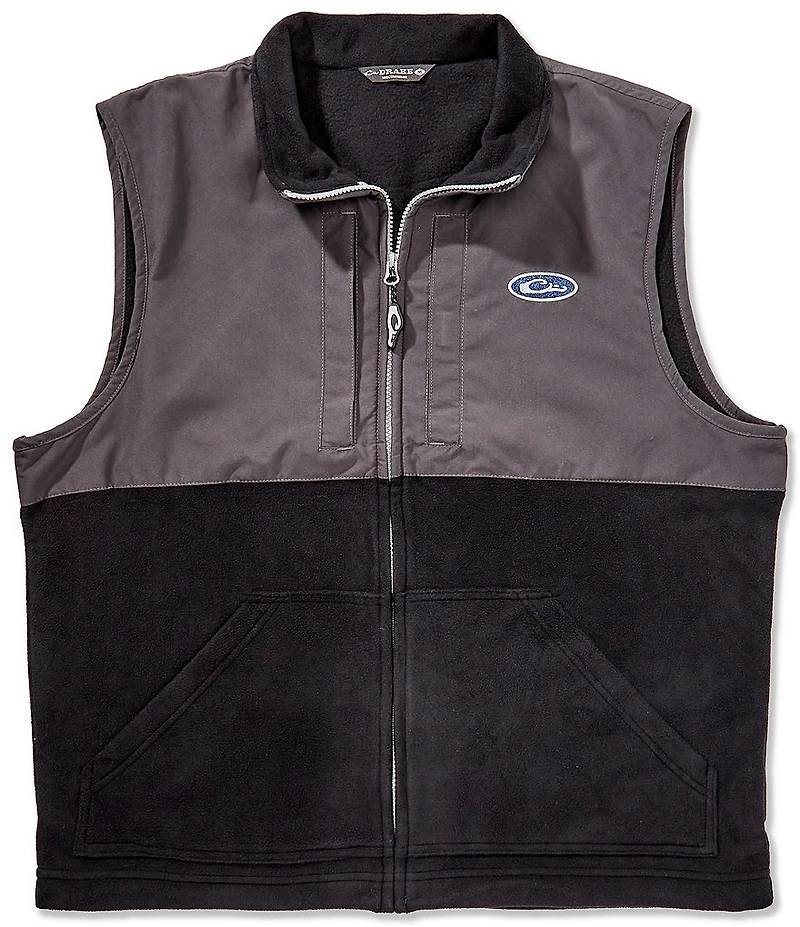 From Drake Clothing Co., this vest features: Color block pattern Mock neck collar Sleeveless Full-zip closure Left side logo patch Dual zip pockets Lower slash pockets Fleece-lined Waterproof Windproof Breathable Refuge HS™ /HyperShield 2.0 Technology upper body Polyester Machine wash/tumble dry Imported.
