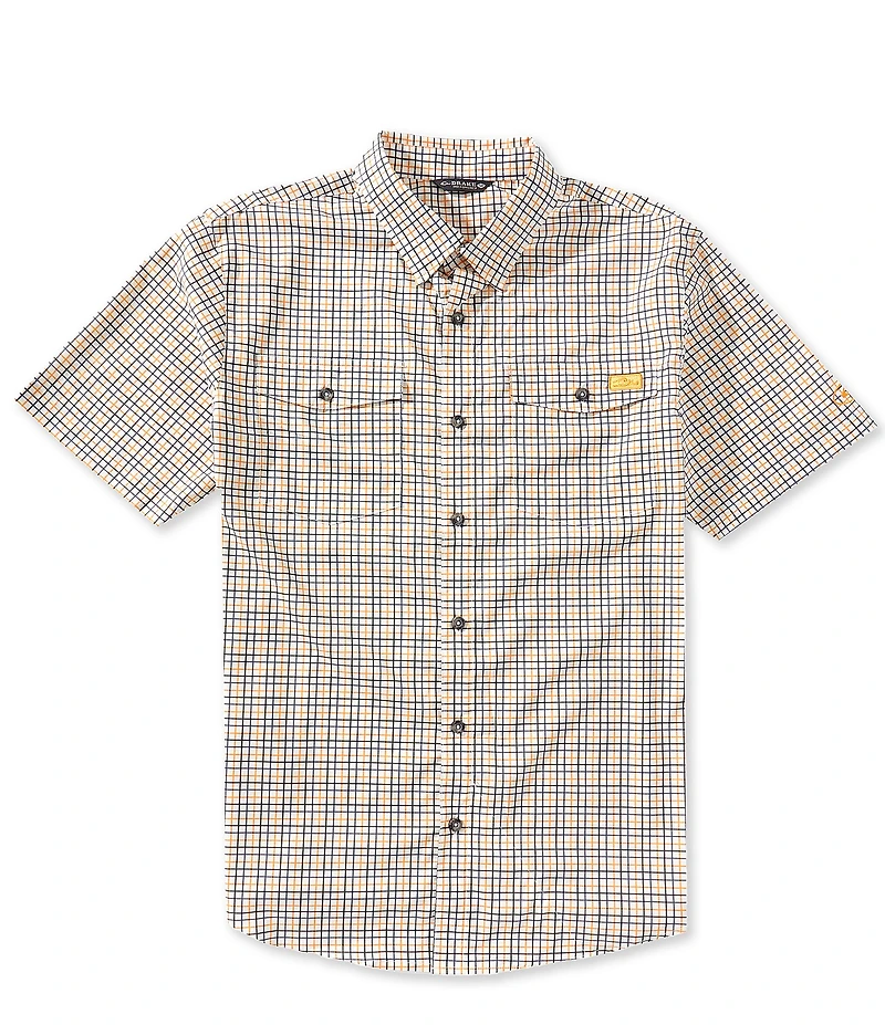 From Drake Clothing Co., this shirt features: Tattersall pattern Hidden button-down collar Short sleeves Button-front closure Dual chest button-flap pockets Vented cape back Sunglass wipe Sculpted hem Built-in stretch UPF 30 Sun Protection Moisture-wicking Quick-drying Nylon/spandex Machine wash/tumble dry Imported.