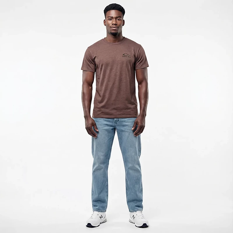 Look your best in the Drake Waterfowl Men's Sunset Dog Duck Short Sleeve T-shirt. It is made of 55% cotton and 45% polyester. The short sleeves keep you cool, and its crew neckline offers a casual style. The full dog and duck enjoying the sunset graphic on the back adds a unique touch.