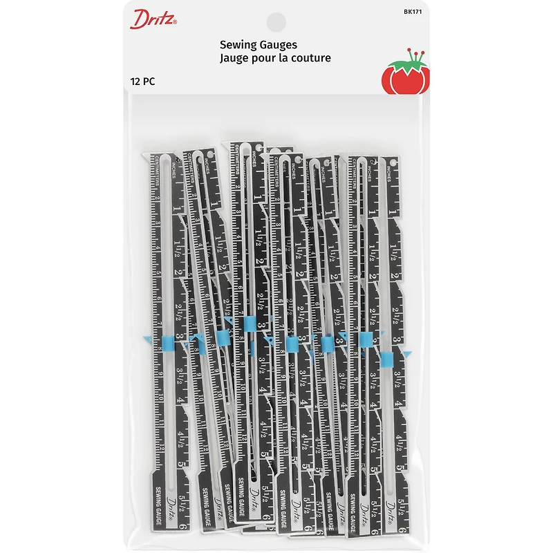 Use the Dritz Seam Gauge for repeat markings and even spacing. The sliding marker can be moved and will stay in place for repeated marking. Use to measure and mark seam allowances and hems, mark pattern alterations and designs. This gauge can also be used to mark buttonhole spacing and length; as well as, to evenly space tucks and pleats.Details:Black6" each12 sewing gaugesUse holes in slider and end of gauge to draw scallops and circlesMetal and plasticPackaged in reusable zipper storage bag