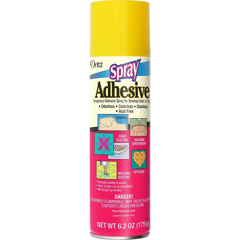 Give a finished look to your projects with the Dritz Temporary Spray Adhesive. The bottle contains colorless and odorless adhesive spray to use for trail fittings of garments, hems, pockets and appliques. You can also use this nontoxic adhesive spray to add sparkly embellishments to your scrapbooks, journals, greeting cards, gift boxes and posters without staining. Quilt basting is easy and quick with this spray. It can be used to hold stencils firmly while creating artwork.Details:Clear6.2 oz.Nontoxic