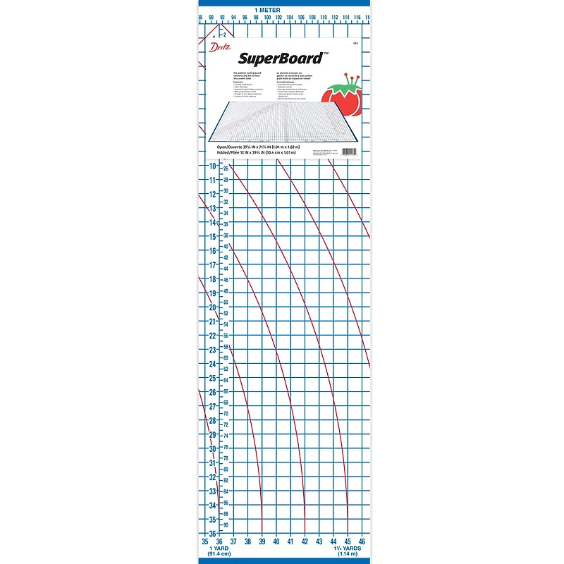 If you are looking for a spacious working surface for cutting fabrics and other craft and home decorating projects, the Open Folded Superboard is a smart choice. It has a sturdy Kraft board construction with a neat laminated finish. For added convenience, this superboard features markings in both directions and lines for cutting nine widths of bias strips and patterns for scallops and circles.Details:White39.75" x 71.75" overall size12" x 39.75" folded sizeDesigned to make sewing projects easy and funConverts any flat surface into a work areaInch and metric measurementsClear markingsFeatures a metric equivalency chartIncludes scallop and circle patterns