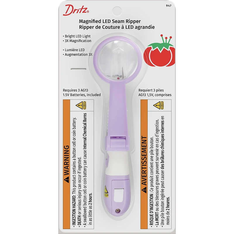 Use the Dritz Magnified LED Seam Ripper for easier stitch removal. The bright LED bulb and repositionable magnifier help you focus in, just where you need those stitches removed. Includes bright LED light, 3X magnification and three AG13, 1.5V alkaline button cell batteries.Details:Sharp, small blade seam ripper with clear, protective capSoft, slip resistant finger grips on handleRemoveable, adjustable magnifier with 3X magnificationBatteries included (3 - 1.5V alkaline button cell batteries)Lanyard hole at base of handle for inserting cord or string