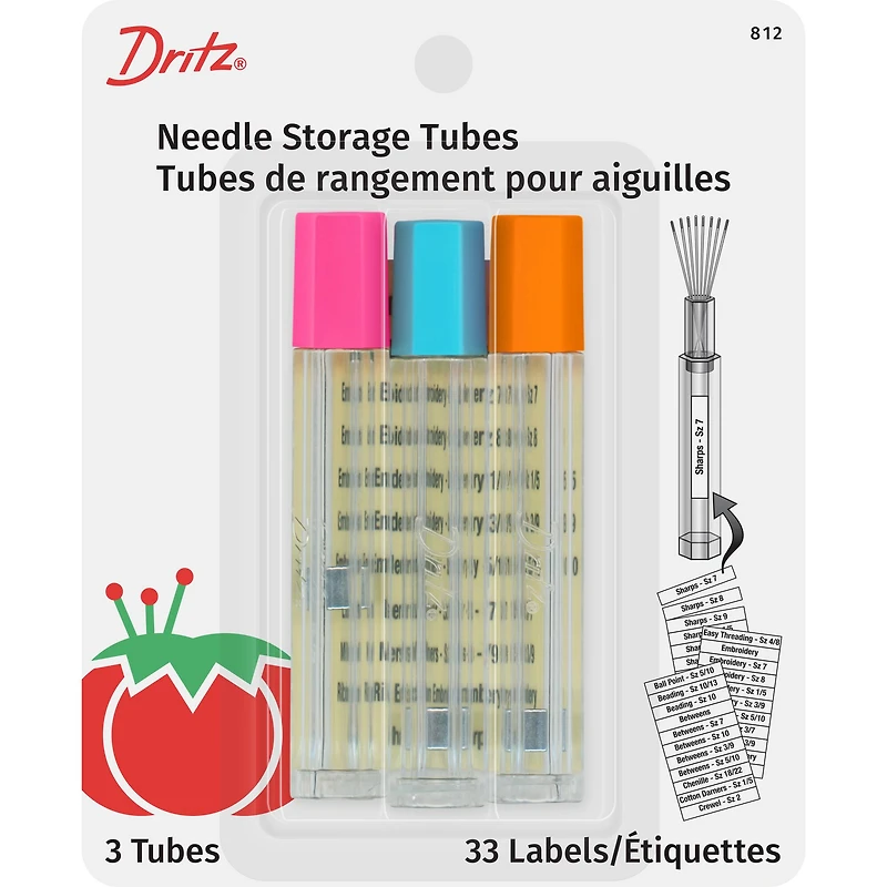 Dritz needle storage tubes with labels are a handy accessory for identifying and storing hand needles for sewing and quilting. Magnetized tube easily dispenses needles for use.Details:Orange, pink and blueFor needles up to 2.25"3 tubesIncludes 33 labels
