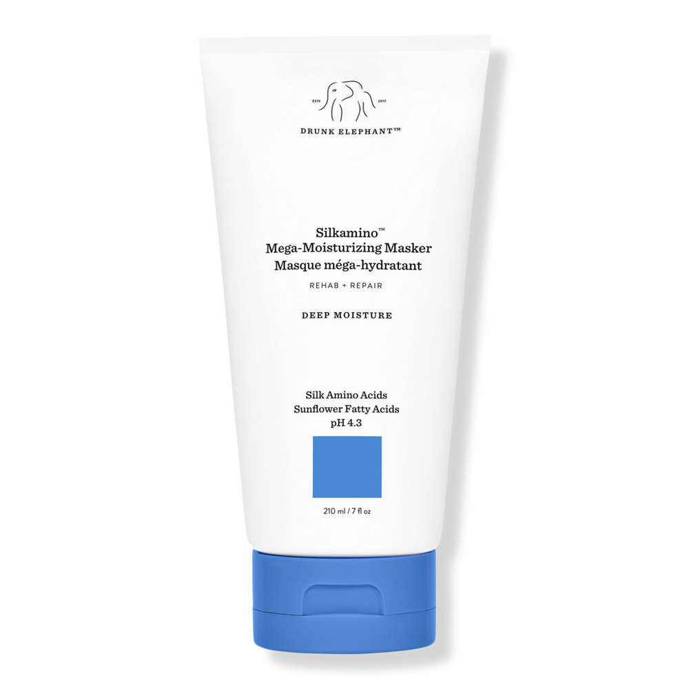 SILKAMINO MEGA-MOISTURIZING MASKER 7.0OZ. Benefits: Strengthens, smooths, and softens dry, crunchy, or color-processed hair. Replenishes lost moisture and seals it into the hair shaft with marula butter, sunflower fatty acids, and panthenol. Formulated without the Suspicious 6 - the six ingredients Drunk Elephant believes are at the root of almost every skin issue (Essential oils, Silicones, Chemical sunscreens, SLS, Fragrances + dyes, and Drying alcohols). Key Ingredients: Hydrolyzed Silk: Conditioning protein that fills in "cracks" in the hair shaft, temporarily smoothing damaged hair between shampoos. Silk Amino Acids: Help to soften, add strength, improve manageability, and give hair a healthier appearance. Silk Sericin: Has a temporary bonding effect on damaged hair, smoothing the shaft and improving manageability between shampoos. Research Results: In a consumer-perception study with 33 participants using Silkamino Mega-Moisturizing Shampoo, Silkamino Mega-Moisturizing Masker, and Silkamino Conditioning Leave-In Milk:. 90% agreed hair was moisturized and conditioned. 90% agreed hair felt softer. 87% agreed the scalp was soothed and hair looked smoother.