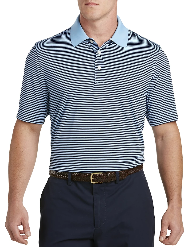Tee time or overtime, this polo shirt is done in an ultra-lightweight, moisture-wicking jersey fabric to keep you cool. The simple stripe pattern is a wardrobe mainstay. Pop the collar to reveal a color shift.