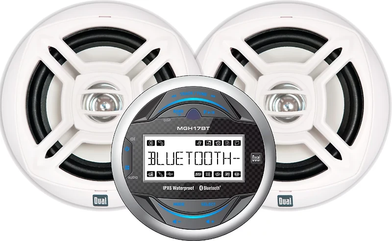 Rock the boat with the Dual 240W Digital Media Marine Receiver with Two 6.5 in Speakers. This waterproof receiver features 18 FM and 12 AM presets to help you find you find your favorite music channels, with 5 unique EQ curves to customize your listening experience. The weather band preset keeps you updated on marine conditions, and the built-in Bluetooth® support provides streaming capability.