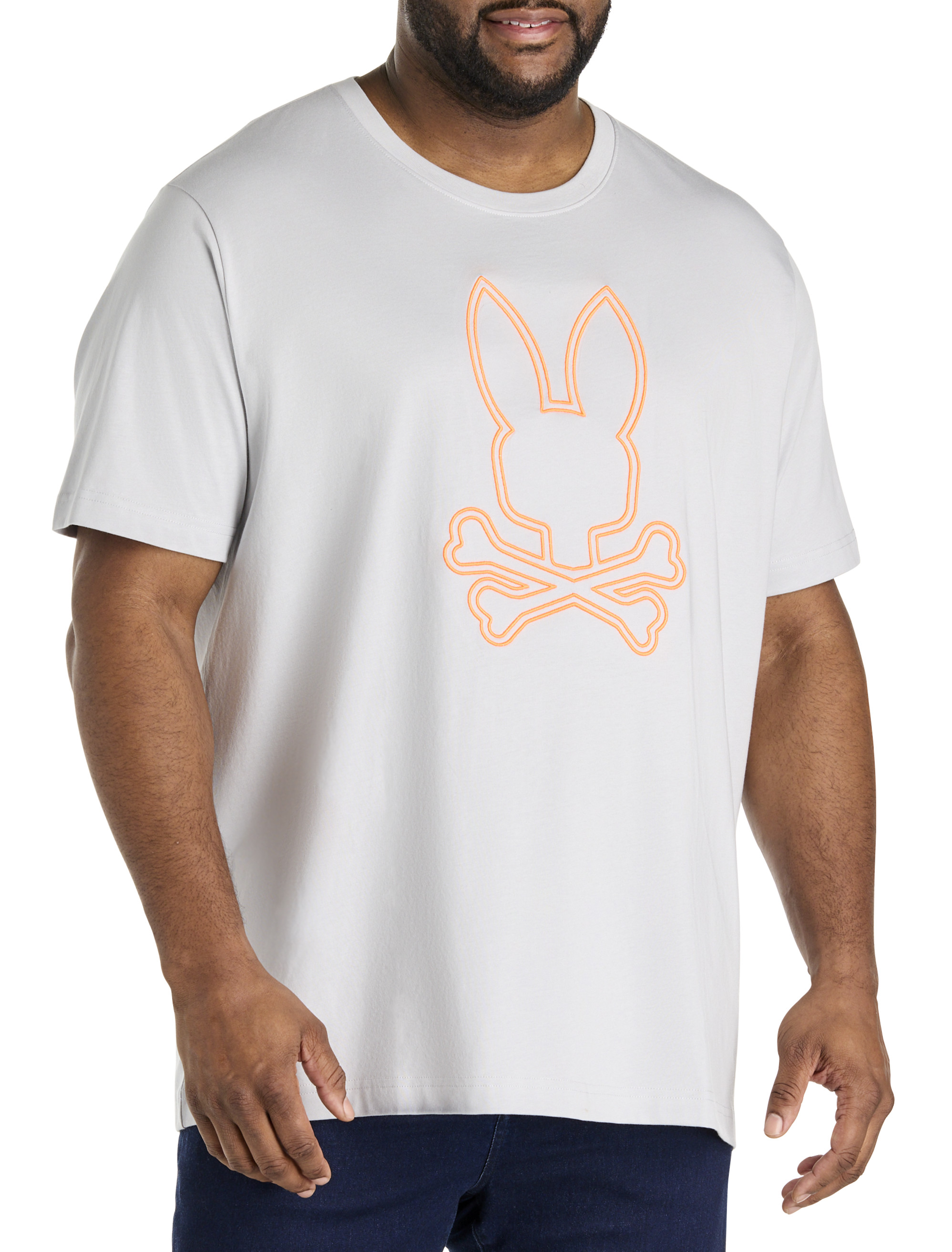 Show that bold bunny love. This Psycho Bunny graphic T-shirt features an eye-catching embroidered bunny logo with a unique shadow effect at the front side. Crafted in ultrasoft Peruvian Pima cotton with a relaxed fit, it features taped shoulder seams to ensure it never loses its perfect shape. It's designed with proper proportions for Big + Tall guys and is set to stand apart as a favorite in your tee collection whether worn as a statement tee or layered under a zip-front hoodie.