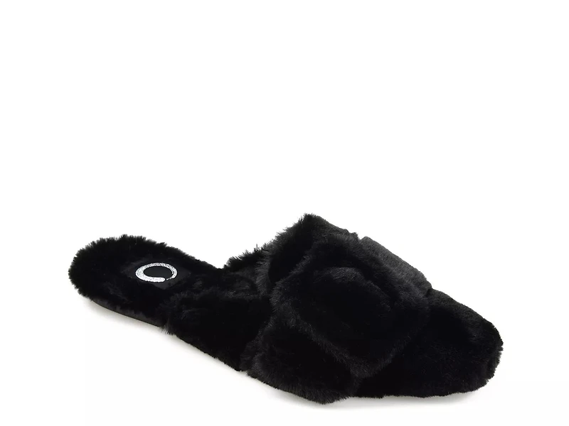 Look cozy, sophisticated in the Eara scuff slipper by Journee Collection. Its mule-inspired silhouette is constructed using fluffy faux fur and is distinguished by a large buckle accent at the vamp.