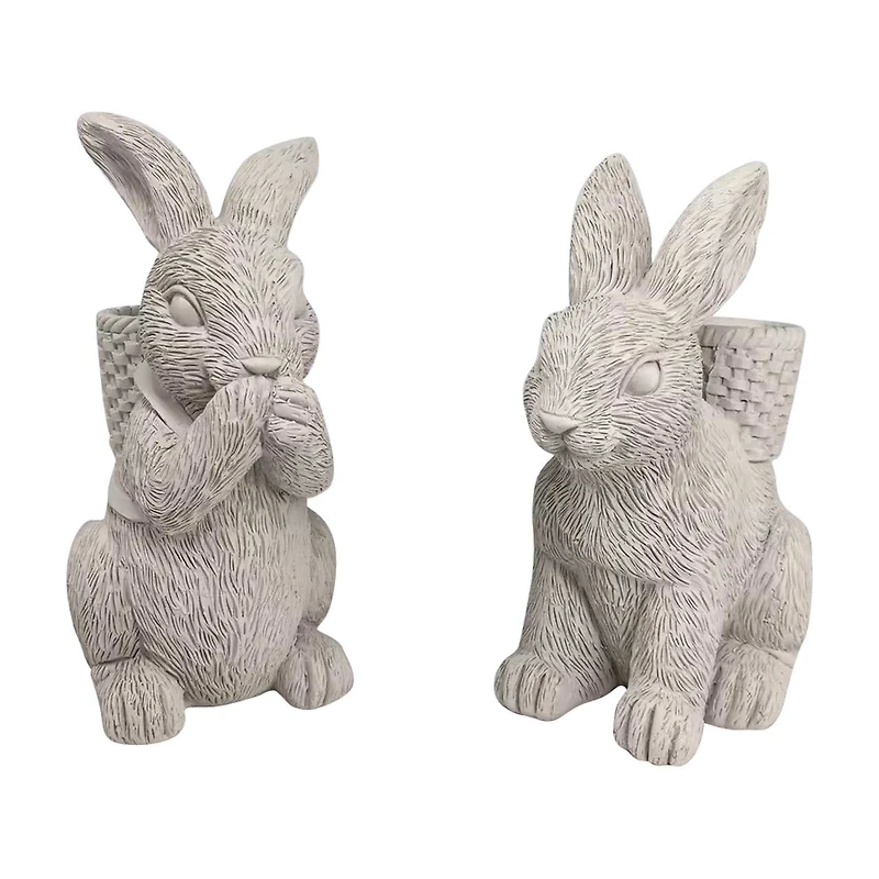 Each bunny is meticulously crafted from high-quality resin, showcasing intricate details that bring these charming creatures to life. One bunny is depicted in a playful pose with its paws up to its mouth, while the other sits attentively, both carrying a woven basket on their back designed to hold your favorite candles. The subtle, neutral finish of the resin allows these candle holders to blend seamlessly with any decor style, from rustic farmhouse to modern chic.