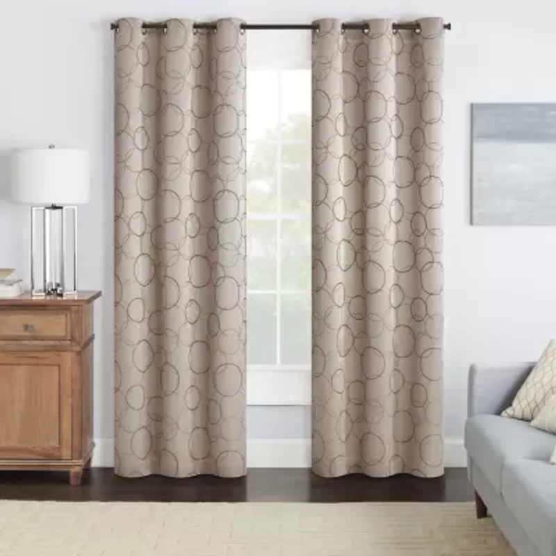 Block unwanted light and sound in your bedroom, nursery, or media room using this Meridian blackout window curtain panel by Eclipse. The repeating circles design creates an other-worldly ambiance, while the foam backing provides insulation for energy savings in your home. The 100-percent polyester fabric is machine washable for easy care.