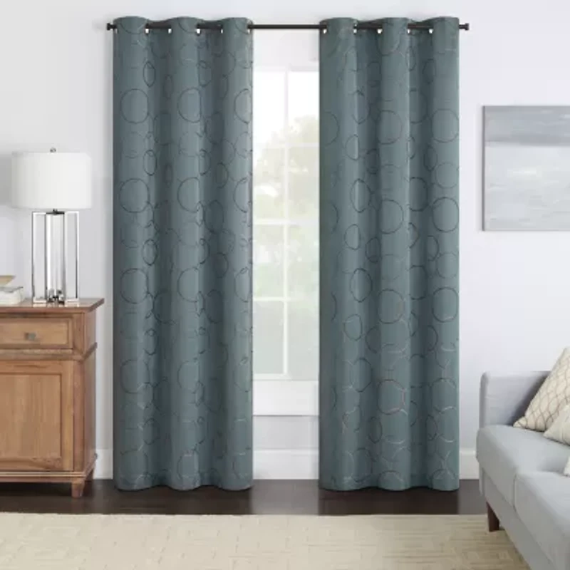 Block unwanted light and sound in your bedroom, nursery, or media room using this Meridian blackout window curtain panel by Eclipse. The repeating circles design creates an other-worldly ambiance, while the foam backing provides insulation for energy savings in your home. The 100-percent polyester fabric is machine washable for easy care.