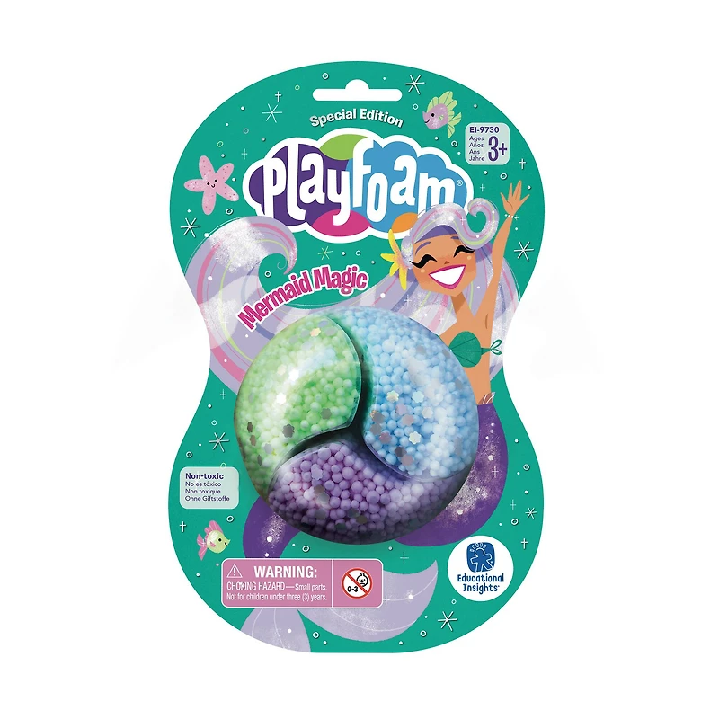 The Playfoam squishologists have unlocked the mysteries of the magical mermaids! One part undersea swirl, two parts silver seashell sequins, Playfoam Special Edition Mermaid Magic includes everything kids need to squish, squash, and sculpt extra-special creations! Limited-edition undersea shades with silver seashell sequins are perfect for sculpting a mermaid's tail and other underwater wonders. Plus, non-toxic Playfoam never dries out so the squishy squashy fun never ends! And sculpting with Playfoam develops creativity and imagination, social skills, fine motor skills, and more. Make something magical with the Playfoam Special Edition Mermaid Magic Jumbo Pod!Details:Includes assorted colorsFor ages 3 and up