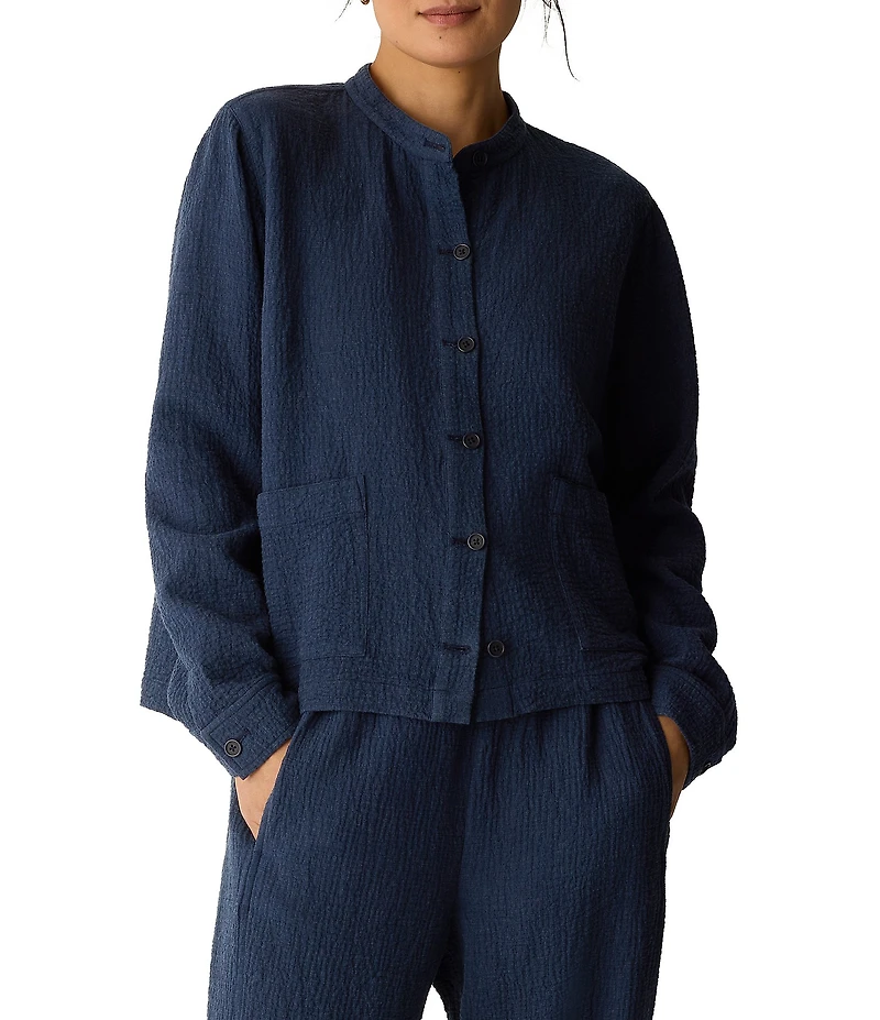 From Eileen Fisher, this jacket features: Crinkle double weave fabrication Mandarin collar neckline Long sleeves Front patch pockets Straight hem Button front closure Approx. 23" length Organic cotton/spandex Machine wash Imported.