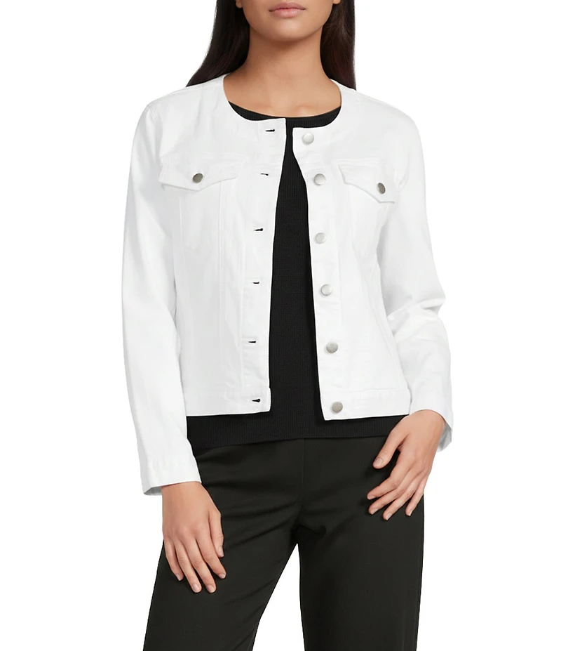 From Eileen Fisher, this jacket features: Denim fabrication Round neckline Long sleeves Front flap patch pockets Straight hem Button front closure Approx. 22" length Organic cotton/spandex Machine wash Imported.