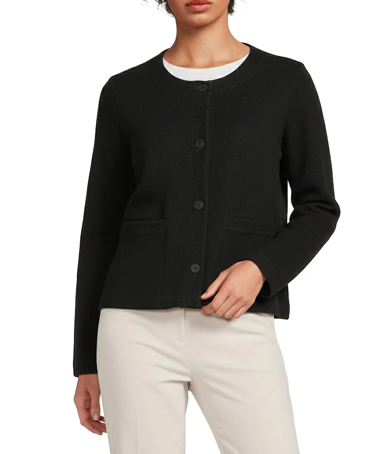 From Eileen Fisher, this jacket features:  Double knit fabrication  Round neckline  Long sleeves Straight hem  Button front closure  Approx. 23" length  Organic cotton  Machine wash  Imported.