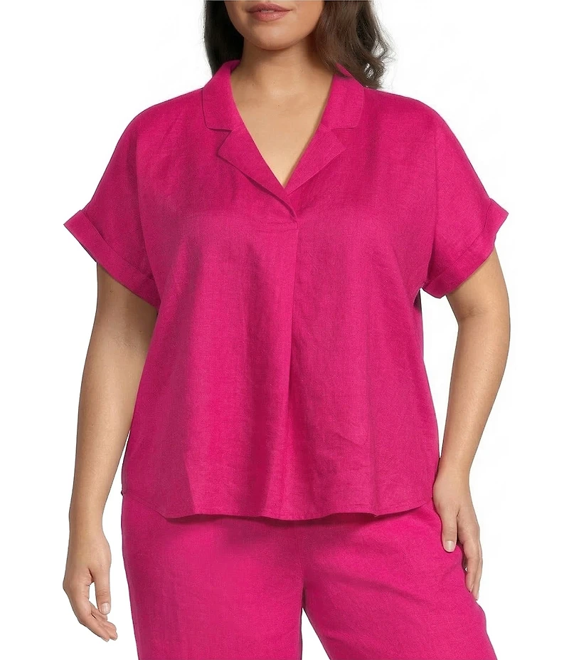 From Eileen Fisher plus, this top features: Woven fabrication Notch collar v-neckline Short rolled sleeves Boxy silhouette Straight hem Pullover construction Approx. 26 1/2" length Organic linen Machine wash Imported.