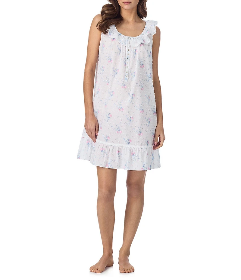 From Eileen West, this chemise features: Ribbon rose floral print Woven fabrication Scoop neckline with ruffles Sleeveless Partial button-front closure with satin ribbon bow tie Pullover construction Approx. 36" length Cotton Machine wash cold/tumble dry low Imported.