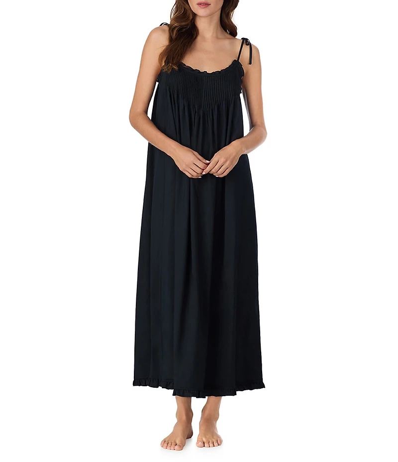 From Eileen West, this nightgown features: Woven fabrication Scoop neckline Sleeveless Ruffle detail at the neckline Adjustable tie straps Ruffled hem Pullover construction Approx. 50" length Cotton Machine wash cold/tumble dry low Imported.