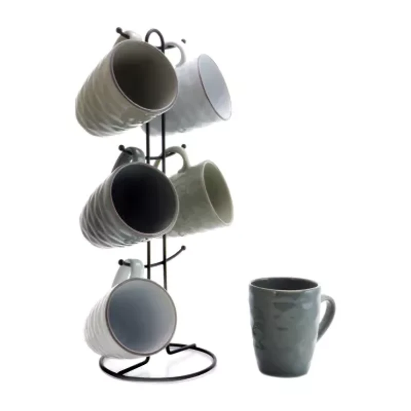 The delicate and elegant Tahitian waves mugs will add some style to your mornings and transport you to the tranquility of the stunning tahitian beaches. Made of durable stoneware, these beautiful cups feature an intricate diamond-like texture for added flair. This set comes with a sturdy metal stand to easily display and store these graceful cups. This set includes six 12 oz mugs, each measuring in at 4.75" x 3.5" x 4" (0.65 lbs.) and one metal stand, measuring in at 16.25" x 5.75" x 5.75" (0.5 lbs.)