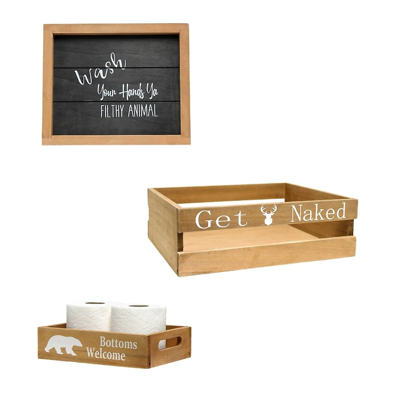 Revamp your bathroom with this three piece matching decorative set. This set will give your bathroom a complete, cohesive look. It includes 1 decorative frame, 1 toilet paper holder and 1 towel holder in a stylish, clean finish to give your bathroom the perfect update! Details: Natural brown finish Fun cabin/lodge themed text and images in white Frame: 12" x 10" x 1"Toilet paper holder: 10" x 7" x 2.5"Towel holder: 14" x 12" x 4.5"Towel holder fits 6 standard bath towels comfortablyToilet paper holder fits 2 jumbo size rolls comfortablyOn-trend farmhouse designPieces easily nest into one another for easy storage100% wood