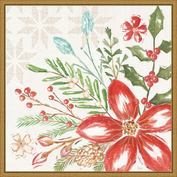 This Elegant Poinsettia Framed Canvas Art Print will bring your walls to life with a bright floral arrangement. Its beautiful design and golden frame will fill any room with holiday cheer! Overall dimensions Width: 22" Depth: 2" Height: 22" Distinctively printed on stretched canvas Uses high-quality, fade-resistant inks Gold frame around wrapped canvas Features a poinsettia and holiday foliage Hues of red, green, white, brown, tan, blue, and gold Artist: Veronique Charron Weight: 2.75 lbs. Hangs from back-mounted hardware Care: Dust with a soft, dry cloth. This item is available at Kirklands.com only, not available in stores. Please note: this item cannot be shipped to APO/FPO addresses.