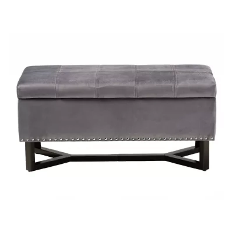 Add a tranquil accent to your space with the Esther ottoman. Made in china, the Esther is comprised of a sturdy wood frame padded with soft foam and upholstered in smooth velvet fabric. Its lift up top reveals a spacious storage compartment for extra blankets and linens. Requiring assembly, the ottoman is set on a dark brown finished wood base that lends an elegant aesthetic. Grid stitching and silver finished metal nail-heads add modern style, making the Esther ottoman an eye catching addition to any space. Dimensions: 17" high x 35" wide x 17.75" deep; seating dimensions: 17" high x 35" wide x 17.75" deep; inner storage: 6.5" high x 33.5" wide x 15.5" deep; legs: 5.75"high;