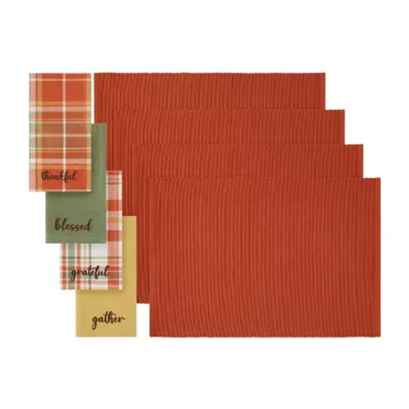 The Harvest Sentiments Placemat and Napkin Value Set brings a rustic look to complement your table setting throughout the fall and autumn season. Harvest inspired, each set features four solid rust colored, ribbed textured placemats and a set of four napkins featuring olive and yellow solid colors with rust, green and yellow plaid designs. The set of four napkins each features a different word "Thankful", "Blessed", "Grateful" and "Gather" embroidered in brown. Excellent for special occasions, events, parties, family gatherings and everyday use during the holiday season. Soft and durable placemats and napkins are made from premium quality 100% cotton. Sold as a set of four placemats measuring 13"x19" and set of four napkins measuring 17"x17". Easy care, machine washable.