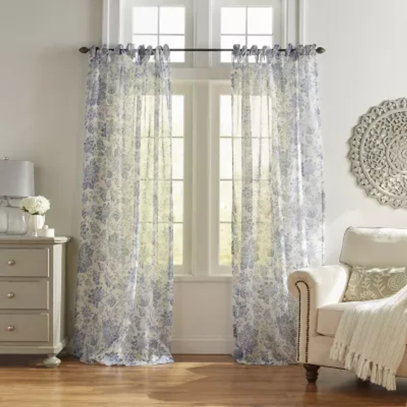 The westport tie-top sheer features a poly/linen texture that has a rich, luxurious hand and soft drape. Distressed, time worn jacobean floral offers a transitional and romantic aesthetic as it softly filters light. Perfect for creating a light and airy aesthetic, while adding a touch of fashion in any room of the home. Bunny-ear tie top header can be adjusted to fit most curtain rods. Ties measure 12 inches each. Loosely tie in knots for more boho aesthetic, or tie in bows for more romantic or traditional looks. Curtain rod not included. Sold as a single curtain. 80% polyester/20% linen. Easy care, machine washable.