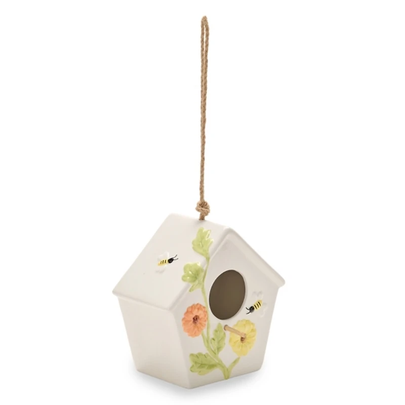 Give your porch or garden a touch of whimsical charm with this Embossed Bees and Flowers Ceramic Birdhouse! Featuring vibrant flowers and buzzing bees, this piece complements any outdoor space. Bird house measures 7L x 4W x 7H in. Crafted of ceramic dolomite Features a bird house design with embossed flowers and bees Hues of white, orange, green, yellow, and black Hangs from a rope loop Safe for outdoor use Care: Wipe with a soft, dry cloth. Contact your local Kirkland's store for availability. Quantities and selection may vary by location. Sold in stores under item number 338427.