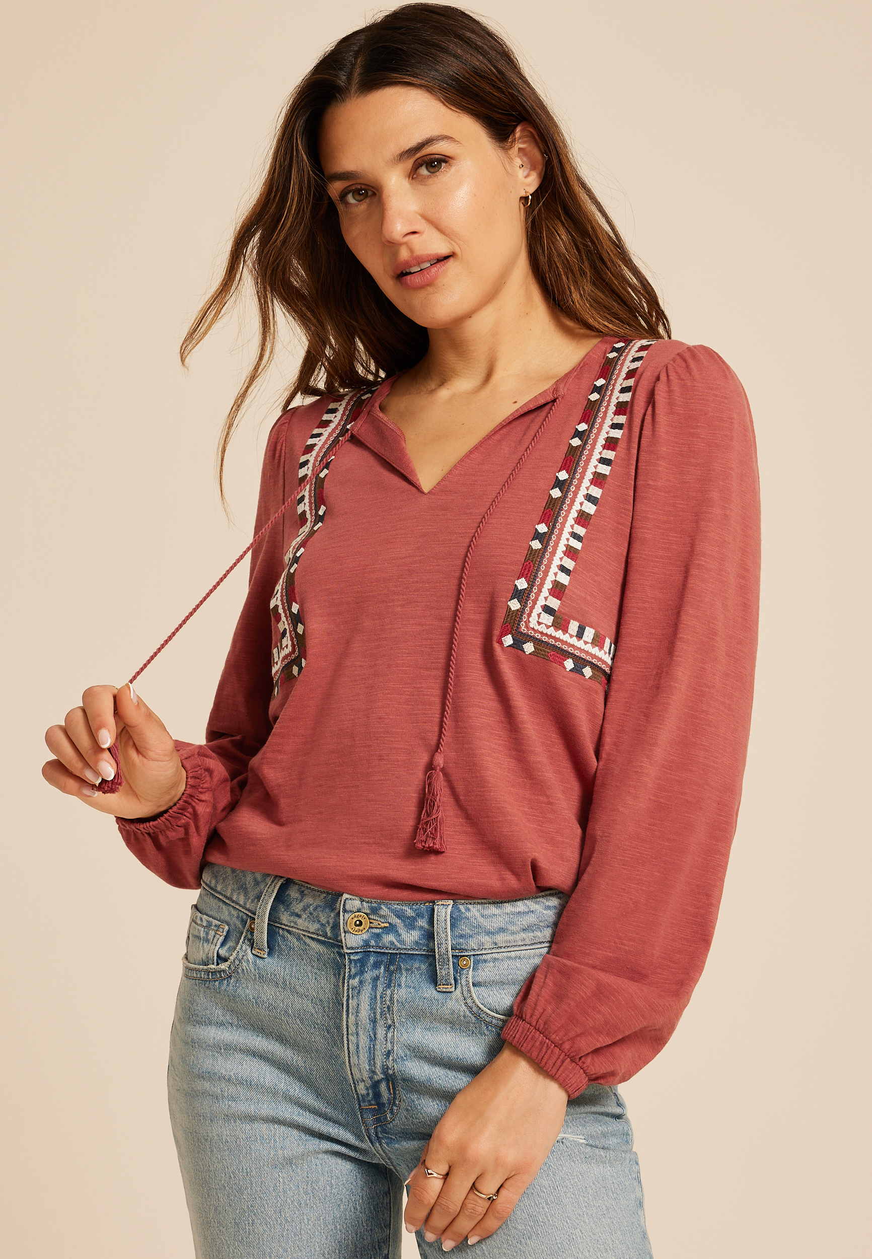 Embroidered Long Sleeve Tie Front Blouse in Chattanooga, TN