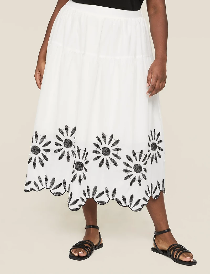 Embroidered Scallop-Hem Tiered Midi Skirt