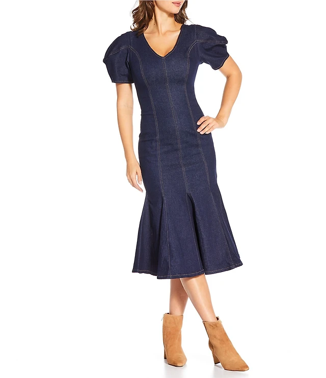 Karen Kane Denim Split V-Neck Short Puff Sleeve A-Line Midi Dress