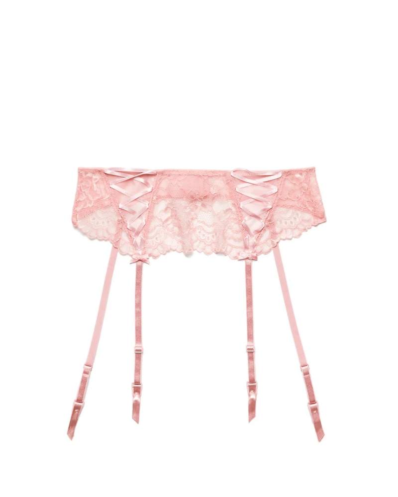 This flirty and feminine garter belt comes in a beautiful light pink hue with lace overlays and a satin ribbon lace-up detail in front. Whether you wear it with your own panties or none at all, this garter belt is sure to ignite some romantic sparks. (Available in plus-sizes 0X-4X.)