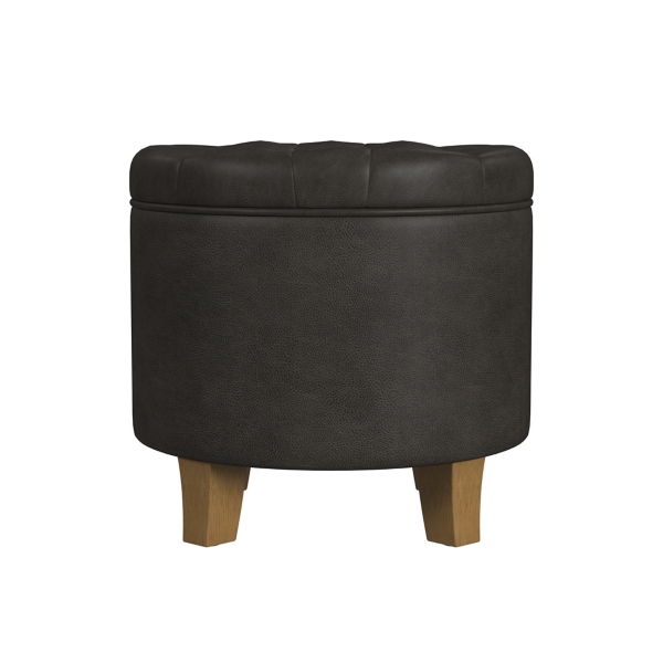 Keep your space tidy in style! This Espresso Faux Leather Tufted Storage Ottoman features a sophisticated look and a hidden storage compartment. You can hide away almost anything, from throw blankets to remotes! Ottoman measures 18H x 19 in. in height Crafted with a plywood and MDF frame Upholstered in faux leather with a foam cushion fill Honey oak leg finish Dark brown upholstery finish Features a tufted lift-off lid Includes hidden storage space Round shape Weight capacity: 250 lbs.; weighs 14.3 lbs. No assembly required Not intended for commercial use Care: Spot clean with damp cloth only. This item is available at Kirklands.com only, not available in stores. Please note: this item cannot be shipped to APO/FPO addresses. WARNING: Cancer and Reproductive Harm - For more information go to www.P65Warnings.ca.gov .