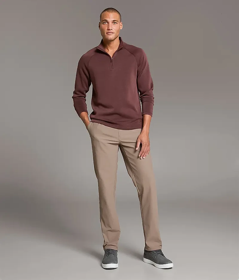 Solid pant Inseam measures 30" Elasticized cinch tie waitband Faux fly Back welt pockets Quick dry