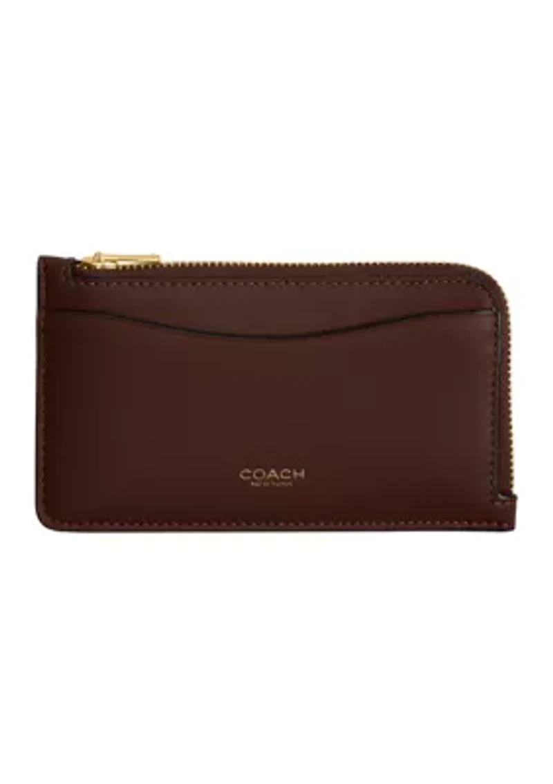 Crafted from luxurious calf leather, this compact card case from COACH is a stylish companion for the modern woman. Its sleek design features five credit card slots, an open pocket and a secure zip compartment to keep your essentials organized and easily accessible. Zip closure Exterior: open pocket Interior: 5 credit card slots Imported Product Specifications 5.5" L x 3" H x 0.75" W Material & Care Leather Spot clean only