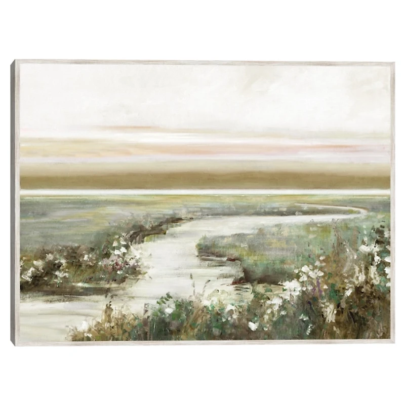 Decorate your walls with the peaceful ripples of our Eternity in Dawn Framed Canvas Art Print! You’ll love the sweet serenity of this streaming water landscape. Art measures 41L x 1.5W x 31H in. Giclee printed on stretched, polycotton blend canvas Wrapped in a whitewashed barnwood frame Features a creek landscape subject Hues of green, ivory, brown, yellow, and white Artist: Sally Swatland Weight: 7 lbs. Hangs from back-mounted hardware; sawtooth hangers included Care: Dust with a soft, dry cloth. Avoid exposure to heat, direct sunlight, and moisture. This item is available at Kirklands.com only, not available in stores. Please note: this item cannot be shipped to APO/FPO addresses.