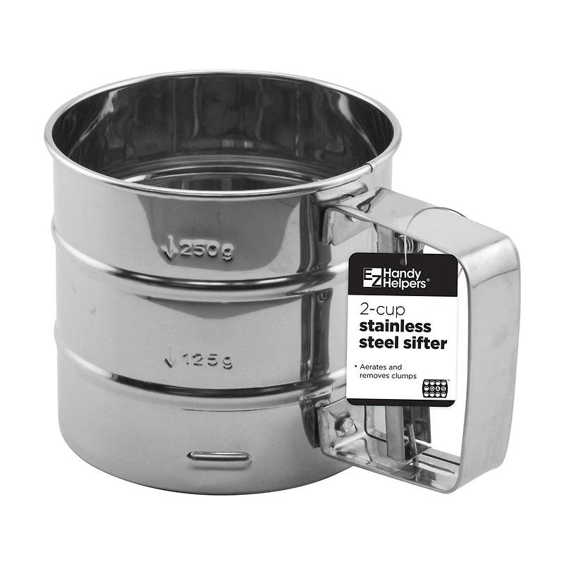 When a recipe calls for sifted flour, reach for EZ Handy Helper 2-cup Hand Sifter. This stainless steel hand sifter aerates and removes clumps from powdered ingredients like flours, sugars and cocoa.
