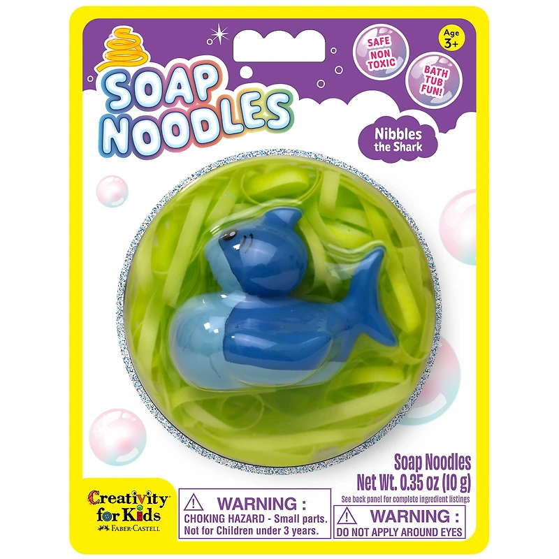 Soap Noodles Nibbles the Shark is a thrilling bath-time companion that brings oceanic adventure to your tub. Shaped like a cheeky shark named Nibbles, these soap noodles are designed for imaginative play and gentle cleansing. Kids can squish, stretch, and swirl the colorful noodles, creating bubbly fun while learning through sensory exploration. Infused with skin-safe ingredients and a refreshing aquatic scent, Nibbles makes hygiene exciting and safe for all skin types. Includes a collectible rubber "shark duck" sitting on a nest of soap "noodles" that dissolve in water to create bubbly clean fun. Cosmetic safety-tested and skin safe. Just pull the drain when the fun is done. Whether it’s a solo splash or a shared bath-time story, this playful shark transforms ordinary washing into a deep-sea escapade full of laughter, creativity, and clean skin.Details:Nibbles the Shark designOverall measures 2.76" x 5.51" x 7.09"Safe and non-toxicEasy to cleanAges 3 and upContents:Soap Noodles 0.35 oz (10 g)Rubber duckWARNING: DO NOT APPLY AROUND EYES