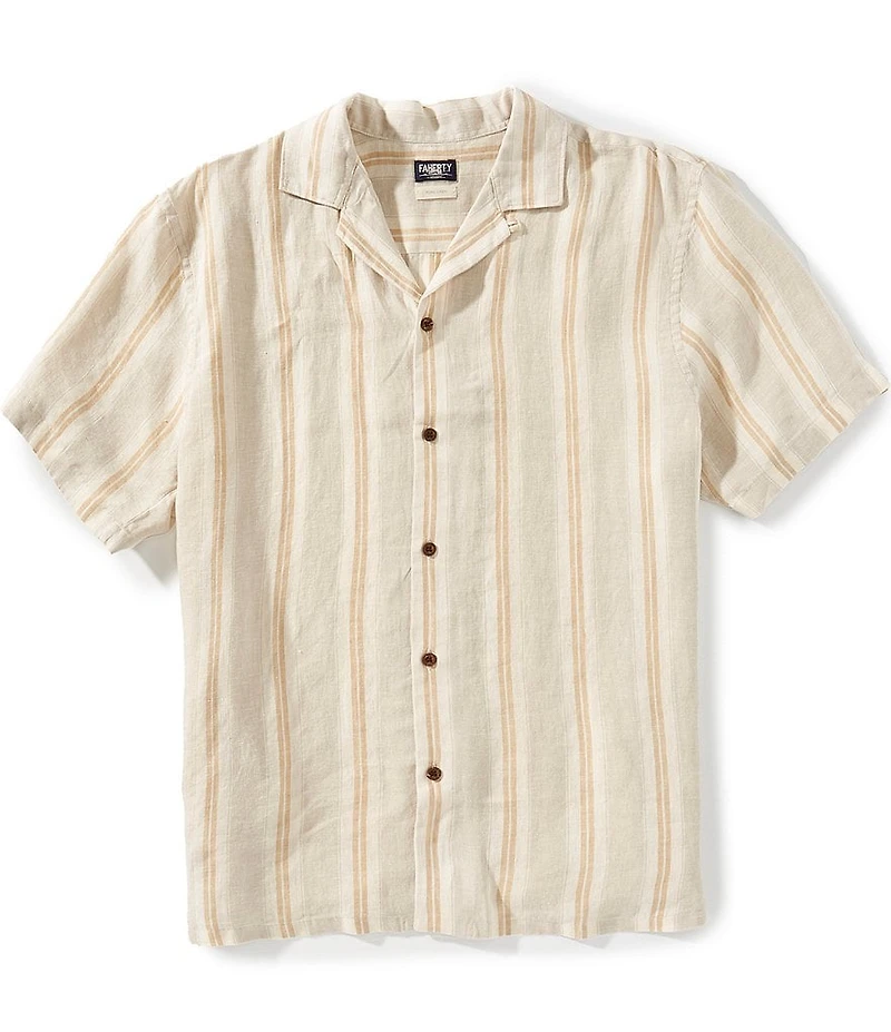 From Faherty, this shirt features: Stripe pattern Relaxed fit Camp collar Short sleeves Button-front closure Left side patch pocket Linen Machine wash cold/tumble dry Imported.