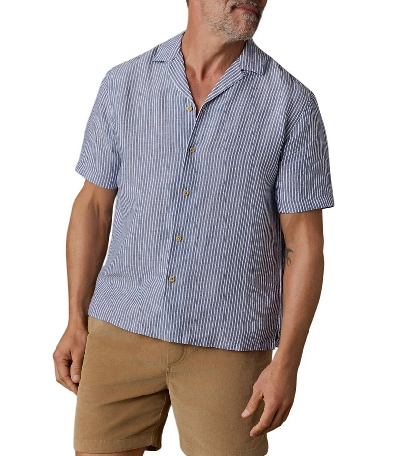 From Faherty, this shirt features: Vertical, stripe pattern Camp collar Short sleeves Button-front closure Straight hem Linen Machine wash/tumble dry Imported.