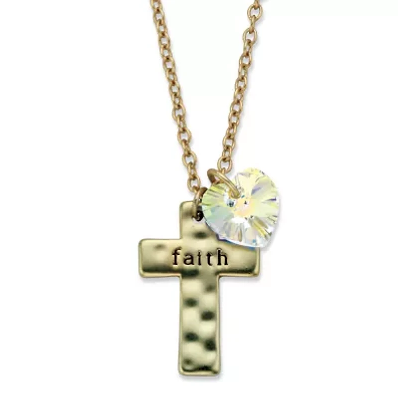 A little sparkle, a little inspiration...this pendant necklace features a cross with trendy hammered detailing and an inscription of "faith" set off by a gorgeously faceted crystal heart charm. 18" length rolo-link chain with a 2.5" extension. Gold tone.Main Stone: 1 Heart Faceted Cut Simulated Aurora Borealis Swarovski Elements Crystal, 10 mm x 10 mmGoldtone; Includes Goldtone ChainPendant: 16 mm wide x 18 mm long x 1 mm high; Chain: 1 mm wide x 18 inches long x 1 mm high, plus 2 1/2 inch extensionIncludes gift box and drawstring pouchGoldtoneIncludes Goldtone ChainPendant Dimensions: 16 mm wide x 18 mm long x 1 mm high, Chain Dimensions: 1 mm wide x 18 inches long x 1 mm high, plus 2 1/2 inch extensionIncludes gift box and drawstring pouch 2 Jewelry clasp, 1 Polished finish Warranty available China Imported Product Specifications 0.67 in x 18 in x 0.63 in, 18" length Material & Care Metal, Gold-Tone Clean with a soft cloth.