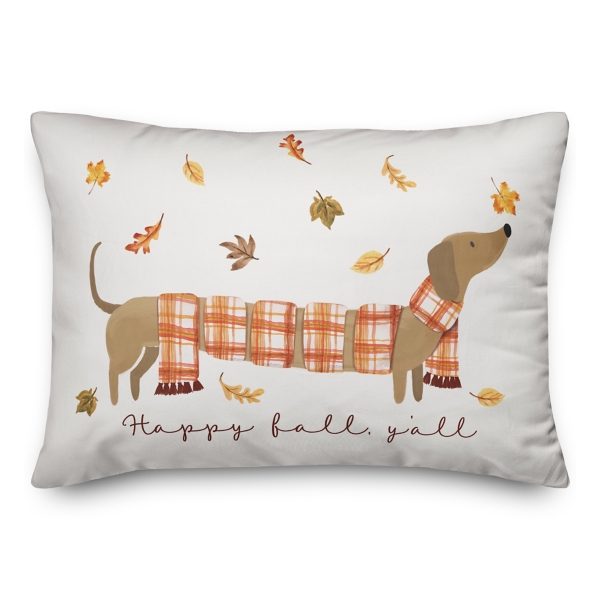 You'll love the adorable touch this Fall Plaid Scarf Dachshund Indoor/Outdoor Pillow brings to your porch! Featuring a dachshund wrapped in a plaid scarf and falling leaves, it's the perfect addition to your outdoor fall decor. Pillow measures 20L x 14H in. Crafted of polyester with a polyfill insert Features a dachshund in a plaid scarf and falling leaves Reads, "Happy fall, y'all" Hues of orange, yellow, red, brown, black, and white Double-sided design Stain, mildew, and water resistant Sewn seam closure to keep moisture out Designed and printed in the United States Care: Spot clean. This item is available at Kirklands.com only, not available in stores. Please note: this item cannot be shipped to APO/FPO addresses.