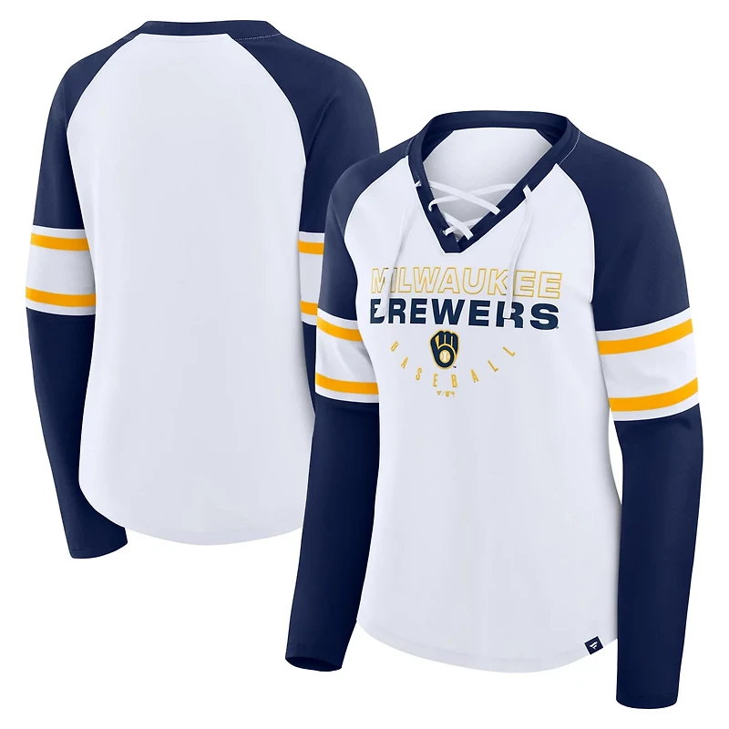 Dress in sporty Milwaukee Brewers apparel with this Blitz Package Raglan Lace-Up V-Neck Long Sleeve T-Shirt by Fanatics It features raglan sleeves for ease of movement and a stylish lace-up neckline Lightweight jersey fabric keeps you comfortable all day in this two-tone Milwaukee Brewers tee